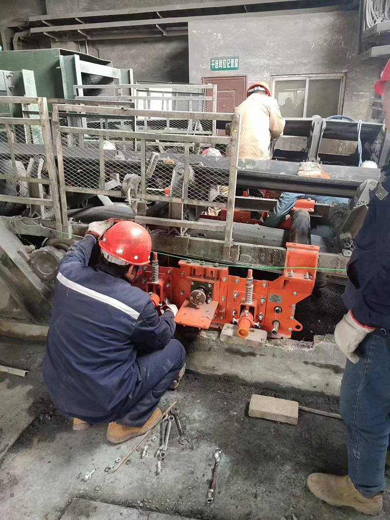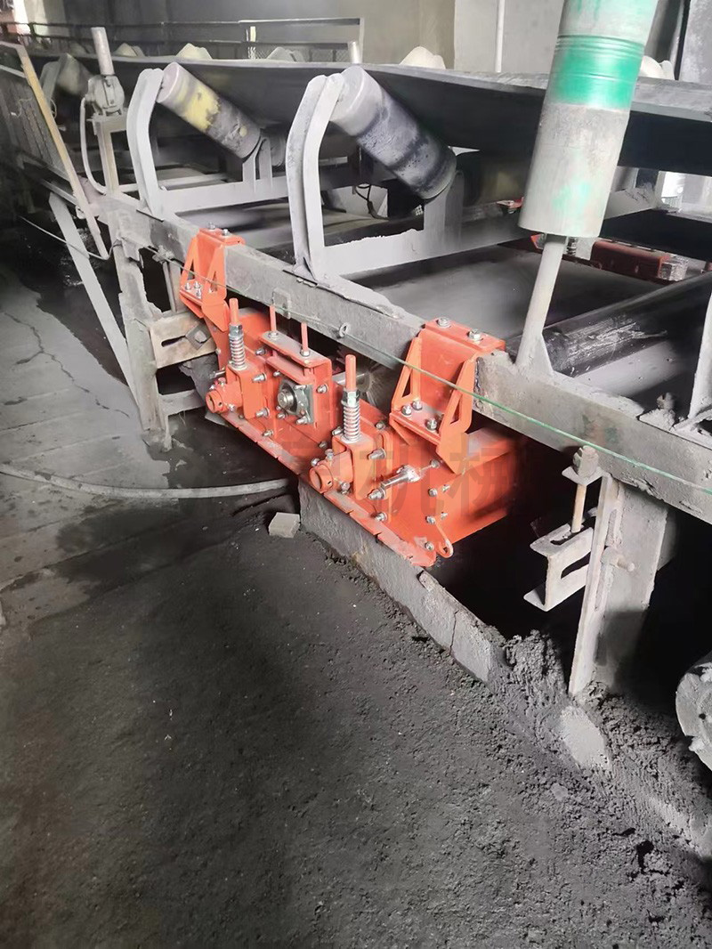 回程輸送帶從水刀進(jìn)入,噴水管可以對(duì)回程輸送帶下表面上的殘留物料進(jìn)行噴淋,使干燥的物料軟化,第一道清掃器刮刀緊貼回程輸送帶下表面,刮除殘留物料,最后第二道清掃器刮刀則將第一道清掃器遺漏的少許殘?jiān)裙纬蓛,第三道為除水清掃器,刮除回程皮帶下表面的水流,最后?jīng)過風(fēng)刀,將回程皮帶下表面吹干。