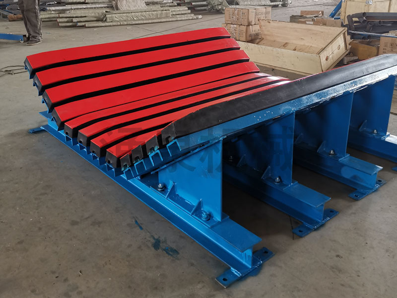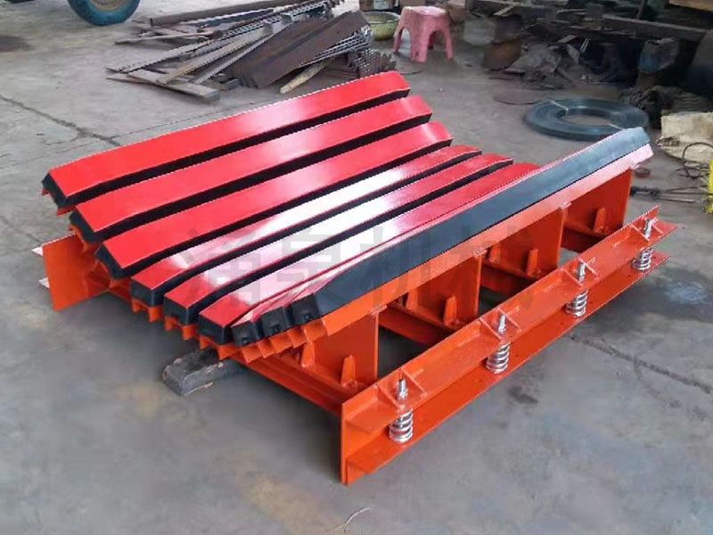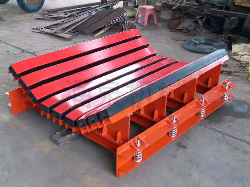 隨著對煤炭生產(chǎn)的安全性、經(jīng)濟性認識的進一步提高,對皮帶運輸機的要求也就越高,而膠帶在整個皮帶機中又是重中之重。在落料口傳統(tǒng)上采用緩沖托輥對膠帶進行保護,而緩沖托輥存在轉(zhuǎn)動件多、維護量大;大塊物料易卡死;沖擊面小等不足。我公司研制開發(fā)的緩沖床就克服了以上缺陷,保證了輸送帶的面與面接觸,支撐面積大,受力均勻,能有效減少皮帶松垂和物料灑落,同時有效防止了由于托輥斷裂、脫落造成的皮帶縱向撕裂,降低了皮帶被銳器或尖銳物料穿透后的撕裂概率。緩沖床沒有運動部件,無需例行維護,有效降低了輸送帶的運行成本。