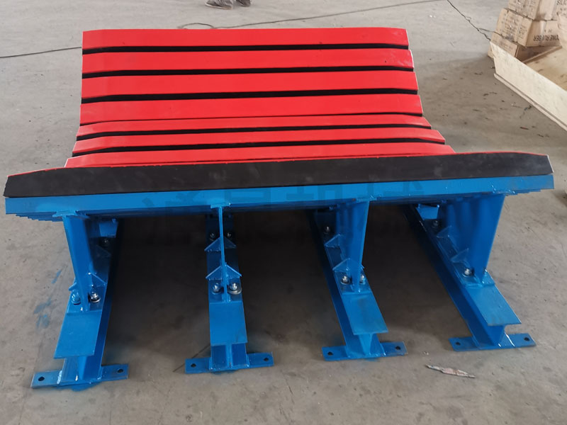 緩沖床主要有緩沖條、加強槽鋼、支架及連接件等組成。緩沖條由緩沖膠條和超高分子量聚乙烯經(jīng)特殊工藝硫化而成。緩沖膠條由骨架和橡膠熱硫化而成,骨架由特型鋁合金制成,骨架主要用來提高緩沖條的強度和連接。加強槽鋼起支撐和保護緩沖條的作用。支架是根據(jù)皮帶機的規(guī)格大小、皮帶的槽型角設(shè)計制作,用來托住和固定加強槽鋼、緩沖條;最終架設(shè)在皮帶機機架上。