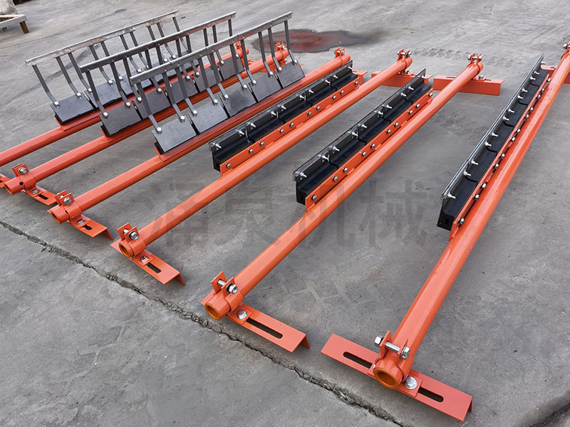 因此,為保證帶式輸送機正常運轉,必須將輸送帶上的附著物清 掃干凈。如果清掃裝置良好,對托輥、輸送帶等的壽命都可以延長。 由此可見,清掃器在帶式輸送機上有著不可忽視的作用。